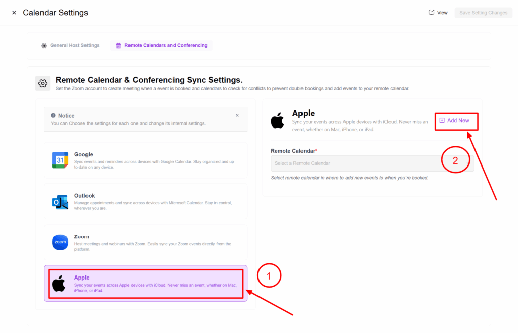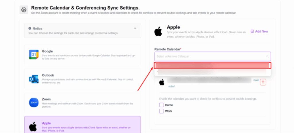 2. Select the Remote Calendars and Conferencing tab. A new section will appear showing all the integrations you can connect with.