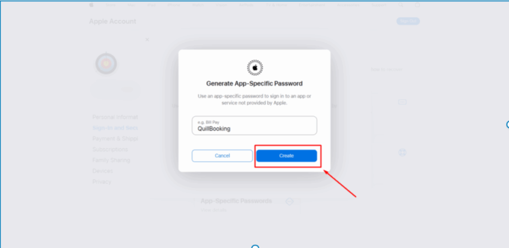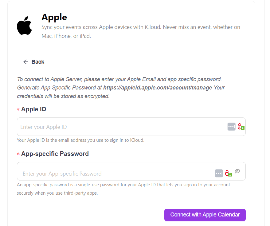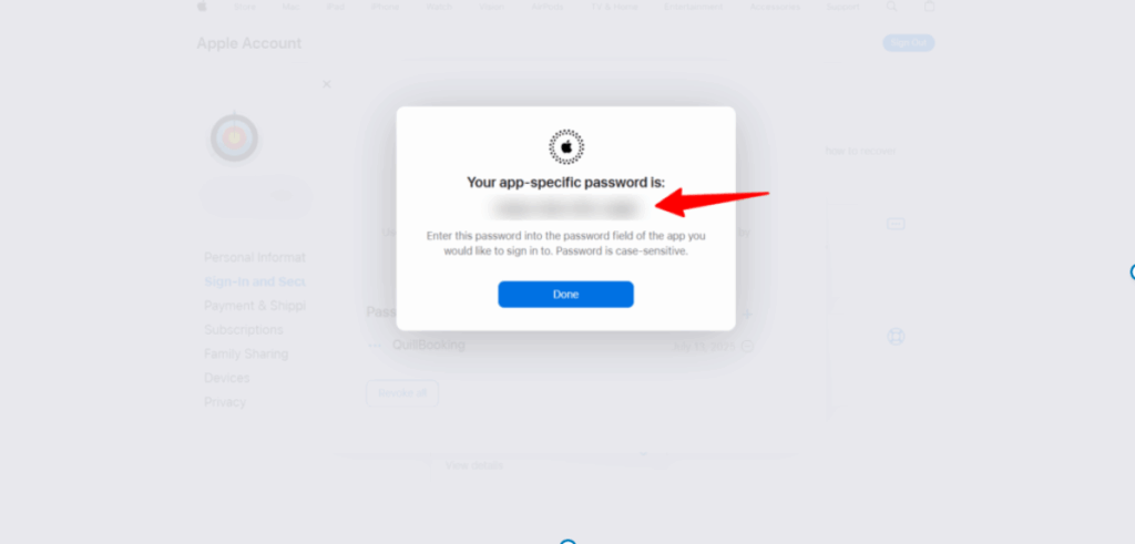 9. Copy the app-specific password and your email (used as your Apple ID), then paste them into the corresponding fields in the form.