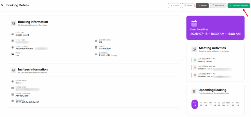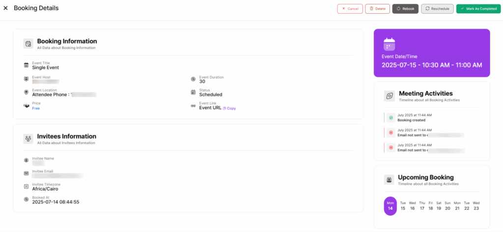 - Upcoming Bookings – Shows any future appointments related to the same invitee or event, so you have full visibility of what’s next.