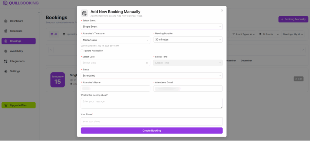 In both cases, a “Add Booking Manually” modal will appear, pre-filled with the original booking data. You can then adjust any details—such as date, time, or invitee—and confirm the new booking.