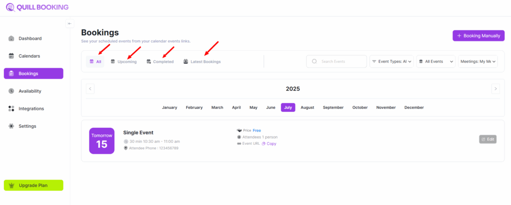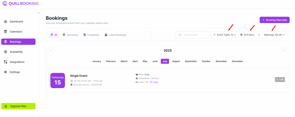 - Filter by Event Type – Narrow down bookings based on event categories (e.g., meetings, consultations, or demos).