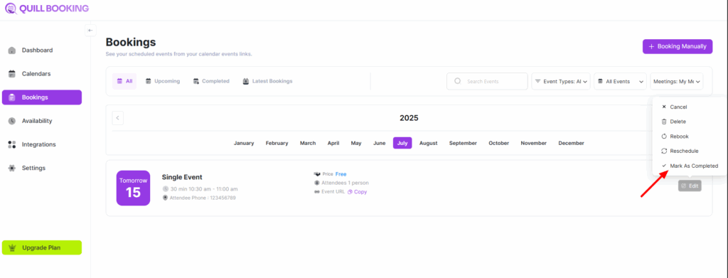 Once marked, the booking status will update, and it will automatically move to the Completed Bookings section for easy reference.