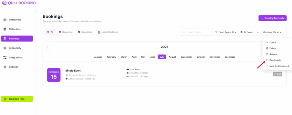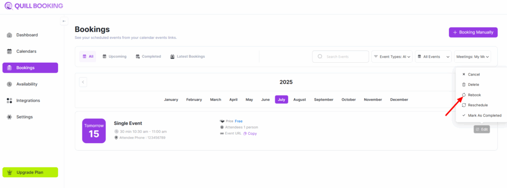 QuillBooking gives you two convenient ways to rebook an appointment: