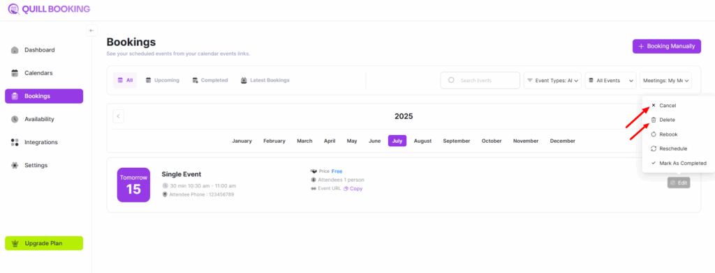 QuillBooking gives you flexible filtering options so you can quickly find the bookings you need. From the top-right dropdown menus, you can: