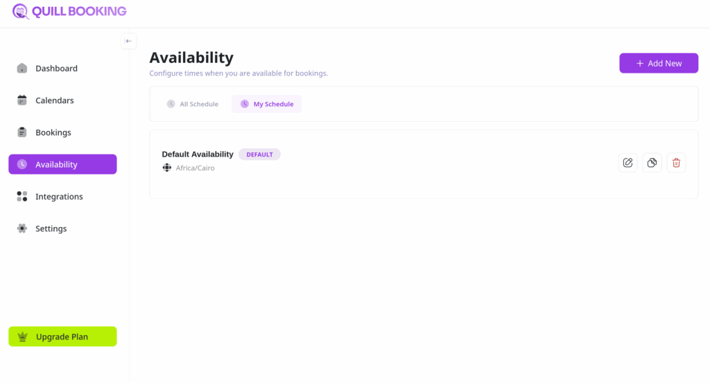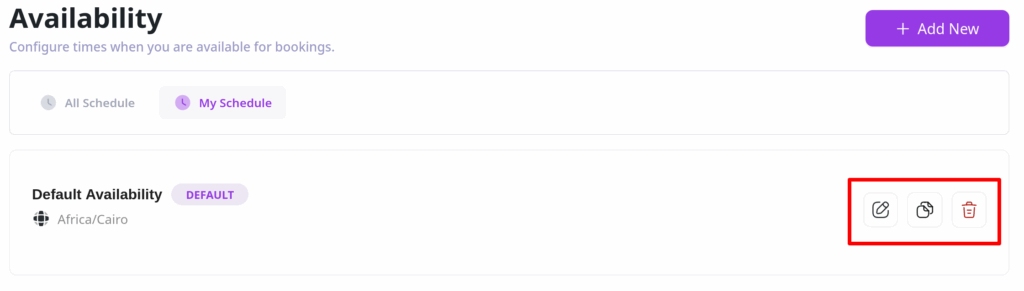 Each availability schedule in QuillBooking comes with a set of management options, accessible via the icons beside each schedule:
