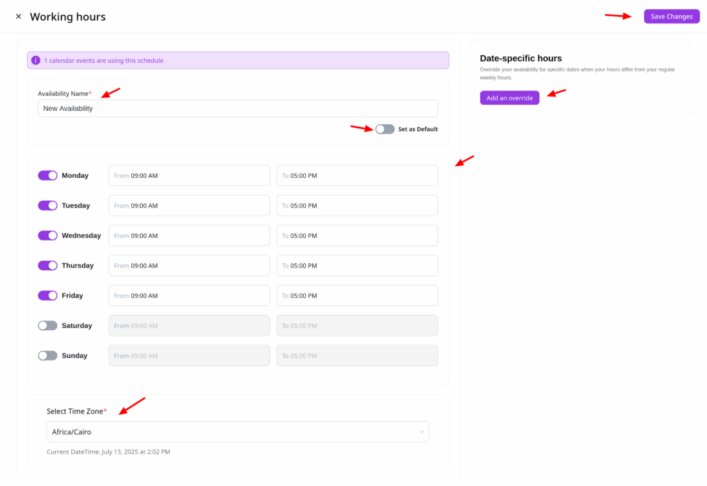 - Add Date Overrides: Mark specific days as available or unavailable.
