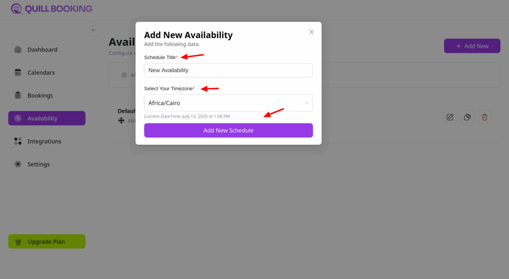 To get started, head to your QuillBooking Dashboard and navigate to the Availability section.