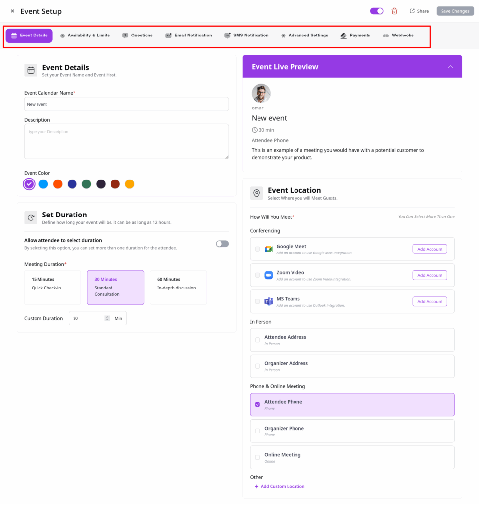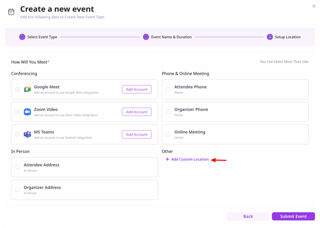 Choose the platform (e.g., Zoom, Google Meet, Phone Call). You can add multiple locations using “+ Add custom location”.