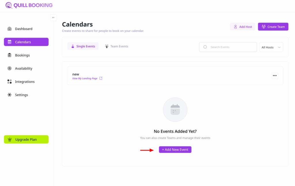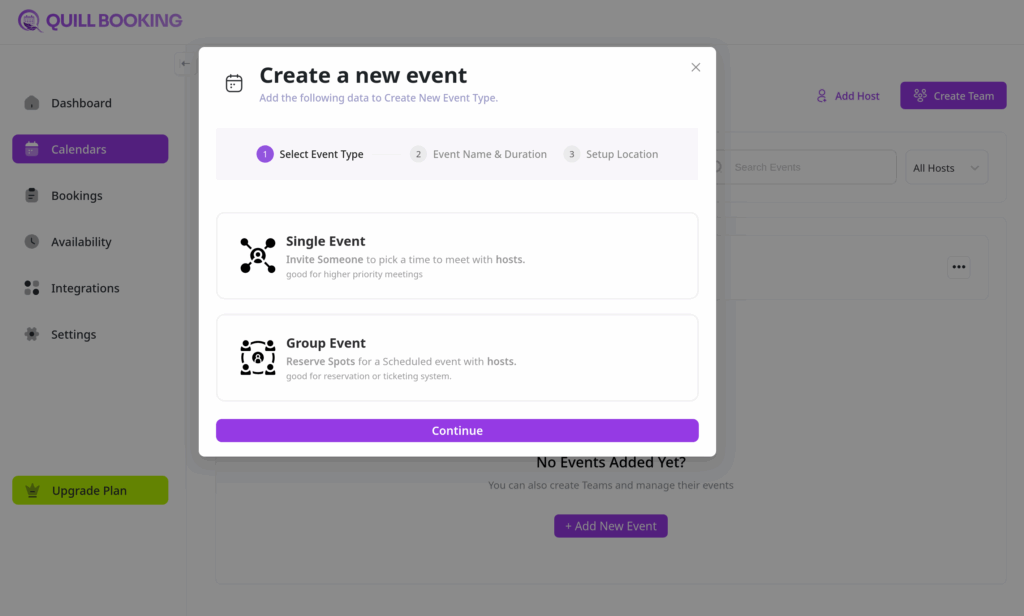 Ensure you’ve already created at least one host in QuillBooking—events must be linked to a host.
