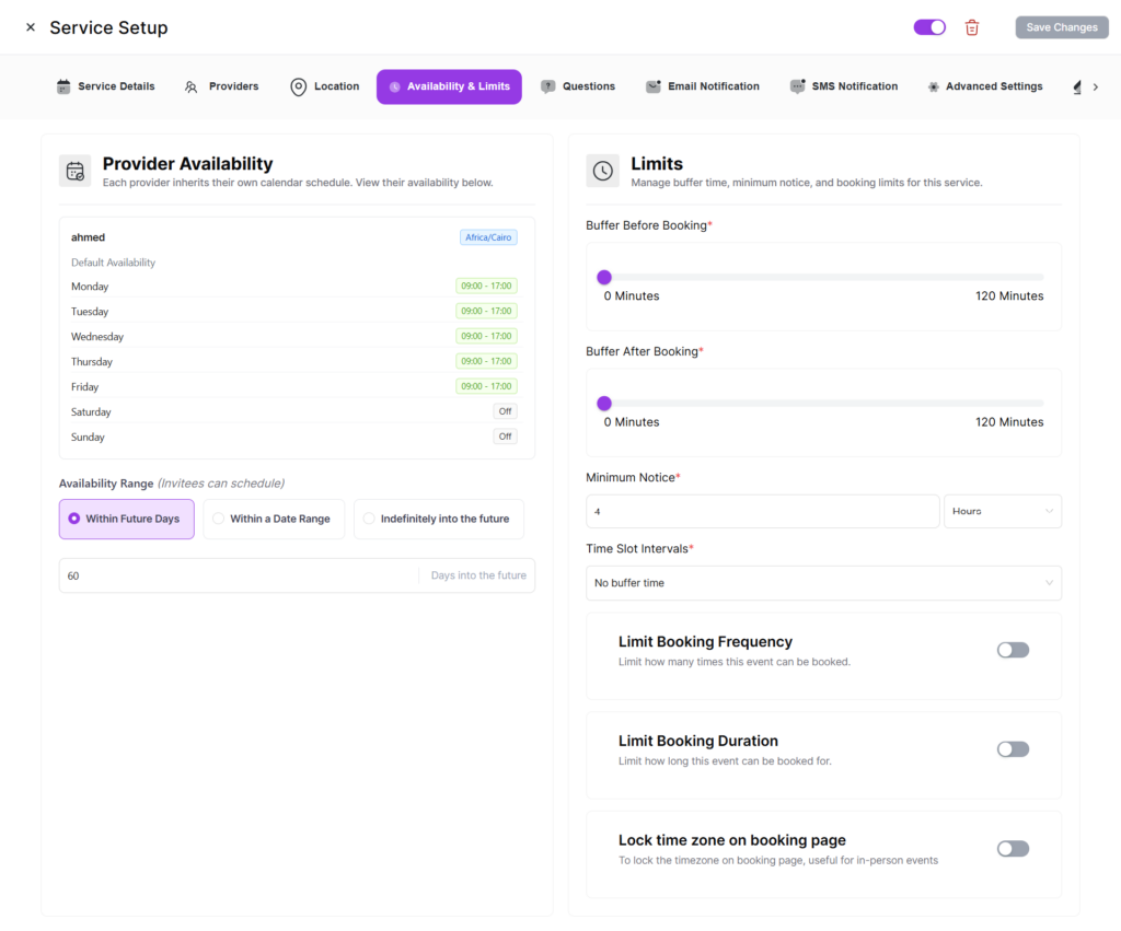 The Availability & Limits tab lets you view provider schedules and configure booking constraints.