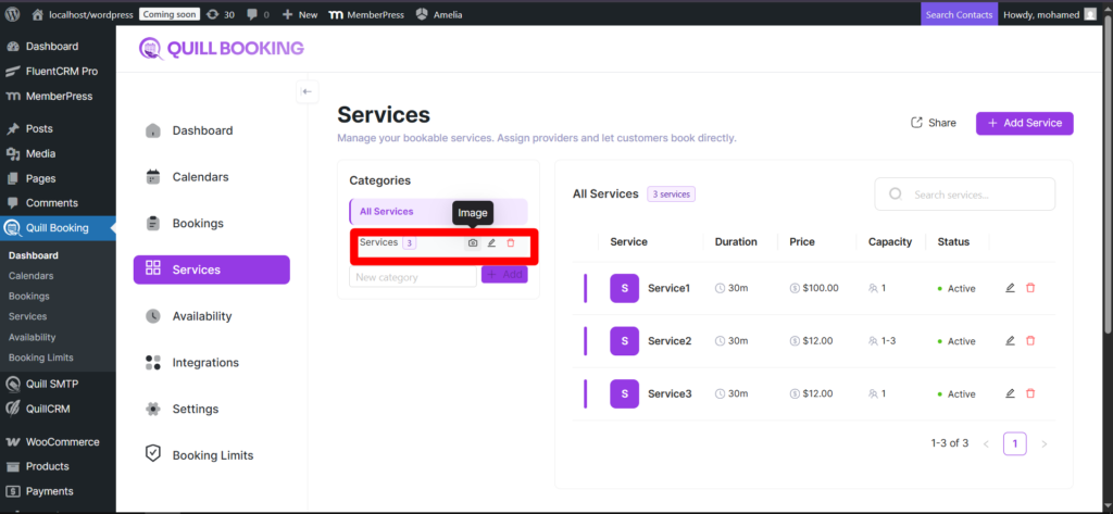 Each category can have a picture displayed on the public booking page. Hover over the category, click the camera icon, and select an image from the Media Library.