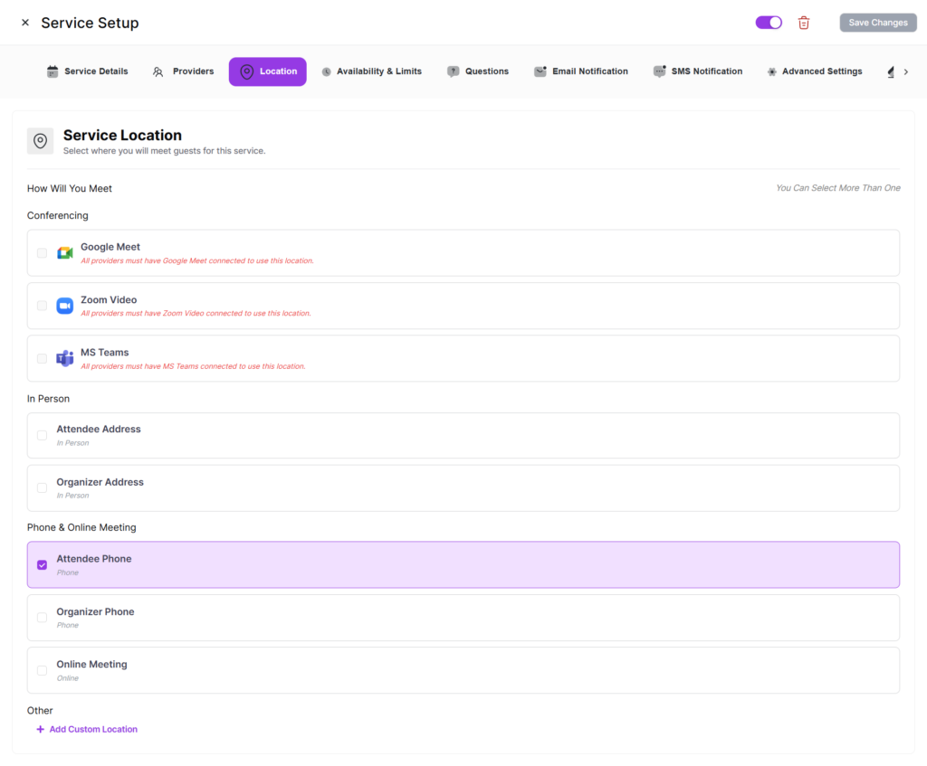 Virtual meeting locations (Google Meet, Zoom, Teams) require at least one provider to have the corresponding integration configured. The service’s connected integrations panel shows availability across all providers.