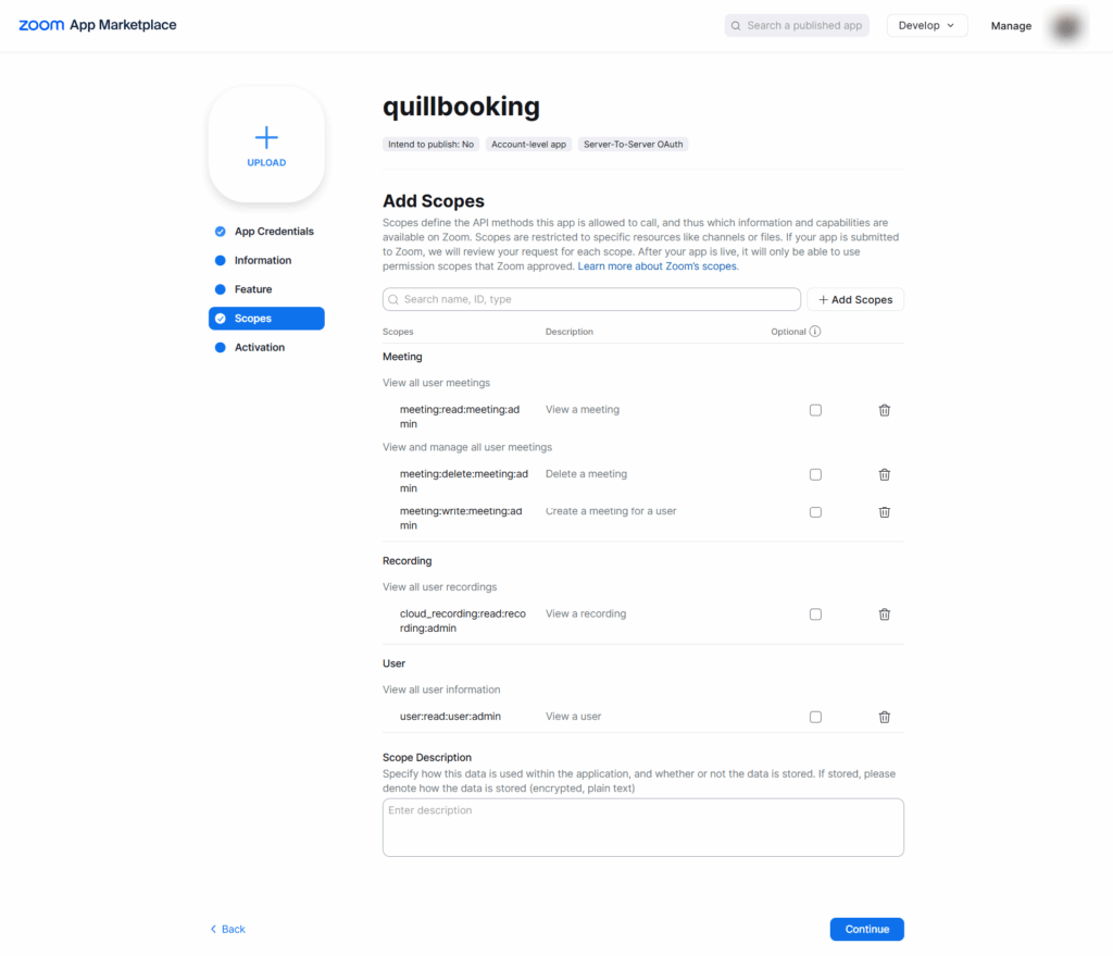 7. In the Scopes tab, add the necessary scopes to give QuillBooking permission to create and delete events and meetings.