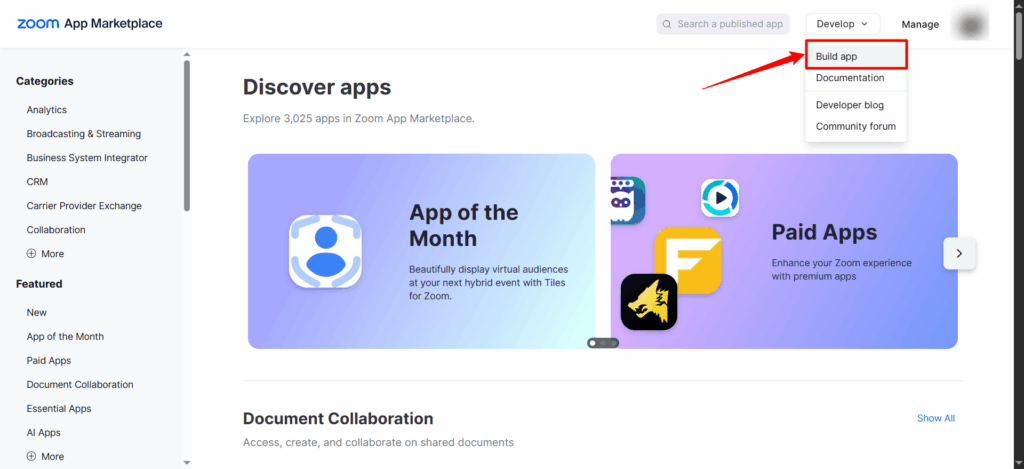4. Then, from the Develop dropdown menu, select Build App.