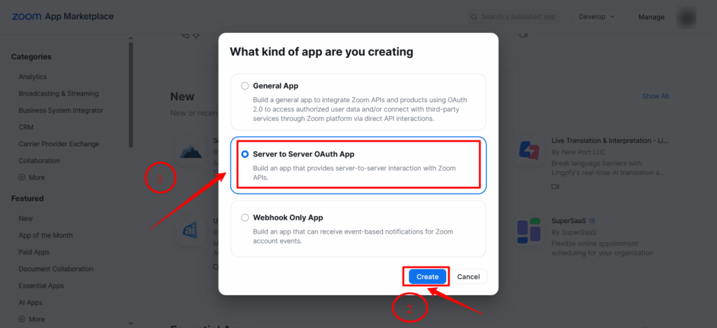 5. Then select Server-to-Server OAuth as the app type and click the Create button.
