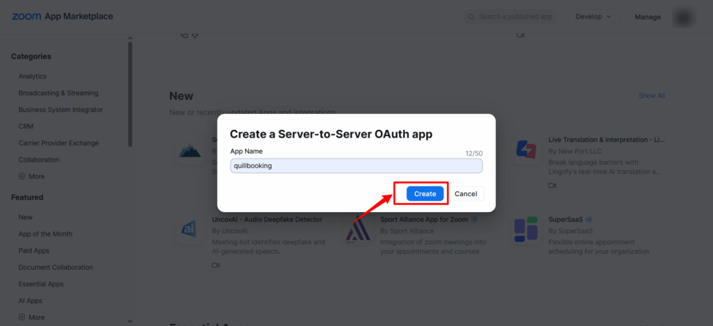 6. Set the app name (e.g., QuillBooking), then click the Create button.