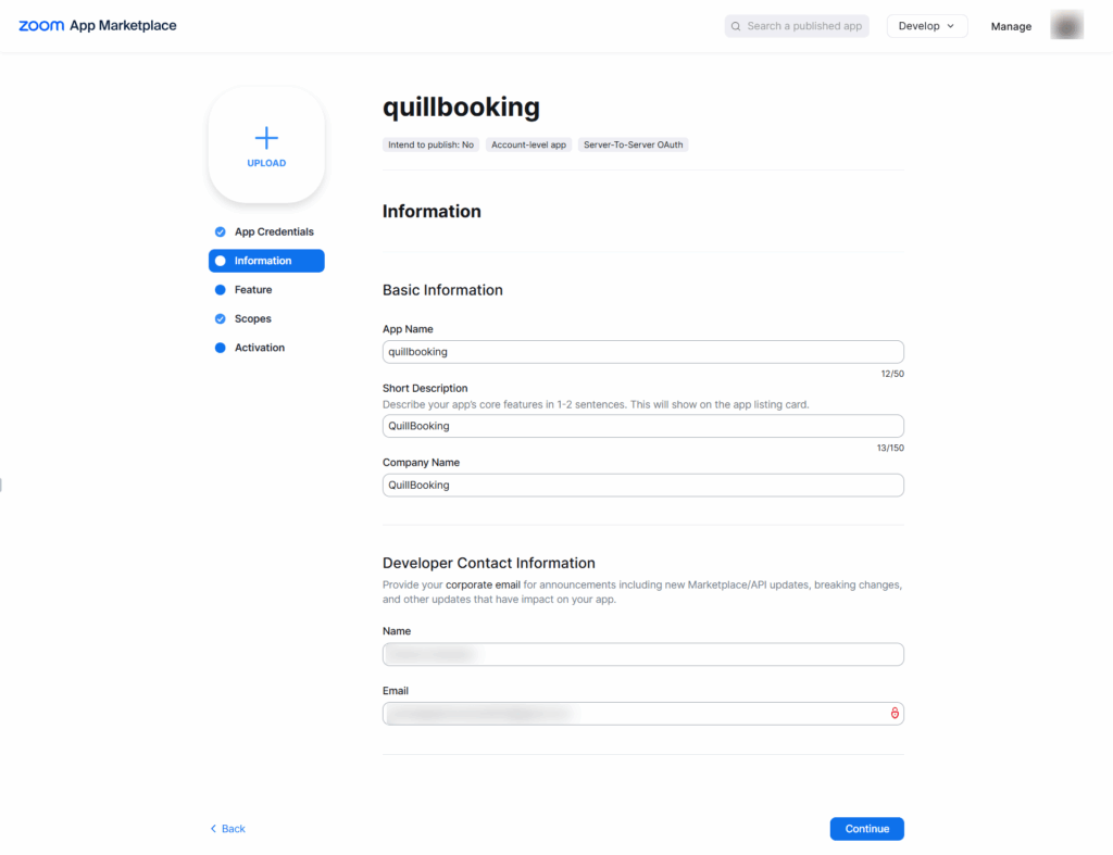 6. Go to the Information tab below, fill in the app name and other required details, then click the Continue button.