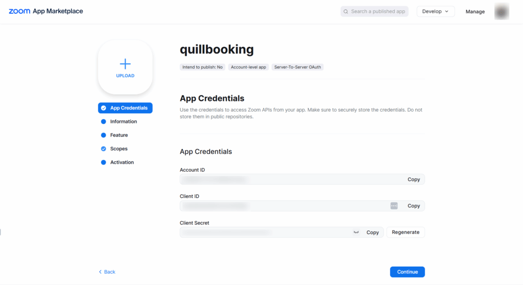 10. Then, go to the App Credentials tab and copy the Account ID, Client ID, and Client Secret.